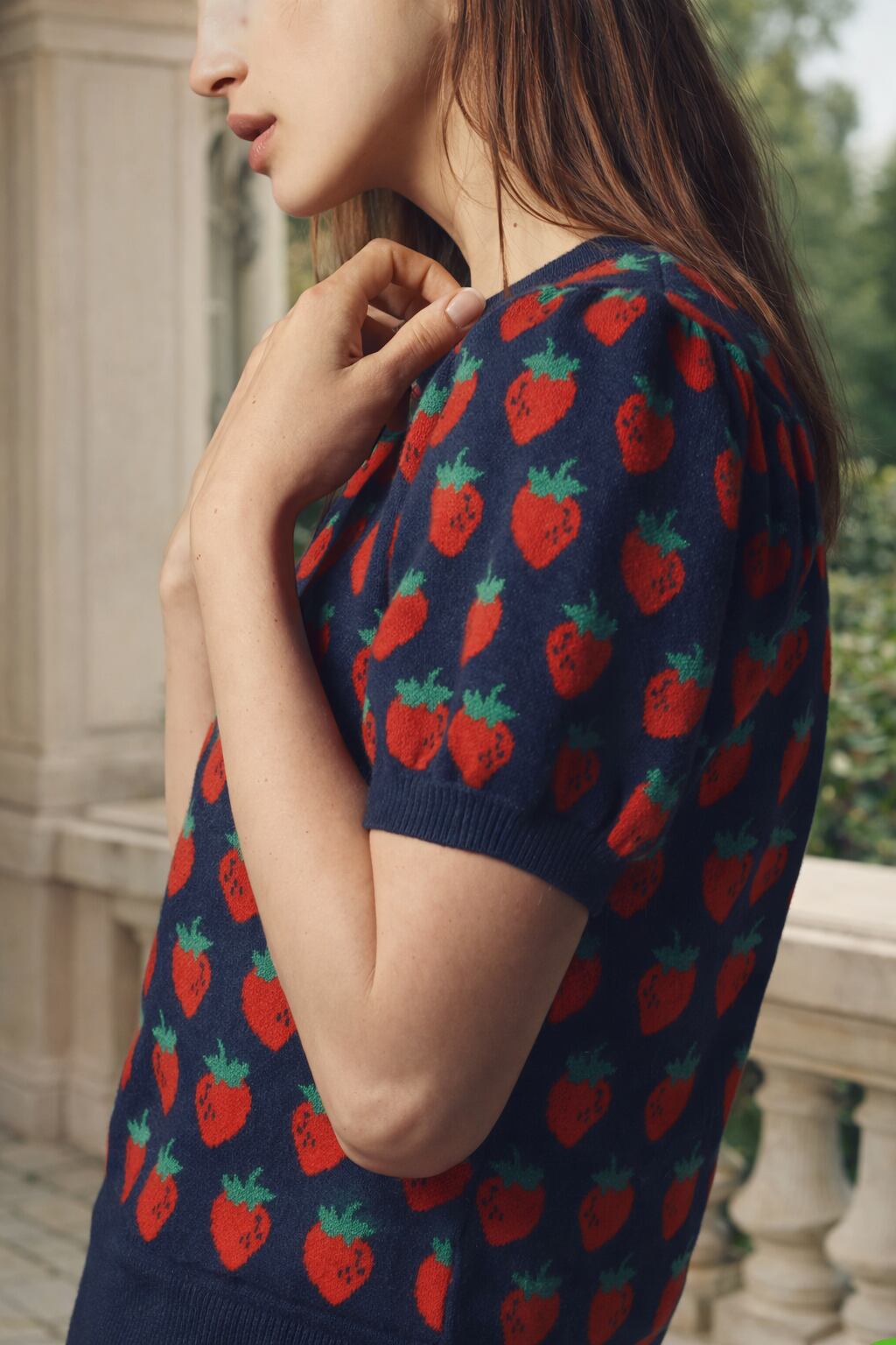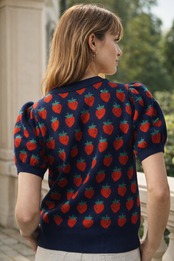 愛らしい苺のモチーフが編み込まれた半袖ニットで、カジュアルながらも個性的な印象を与えます。軽やかな素材感が特徴で、動きやすさも抜群なので、普段使いにも最適です。また、ゆったりとしたシルエットがリラックスした着こなしを演出し、体型を気にせず着こなせます。